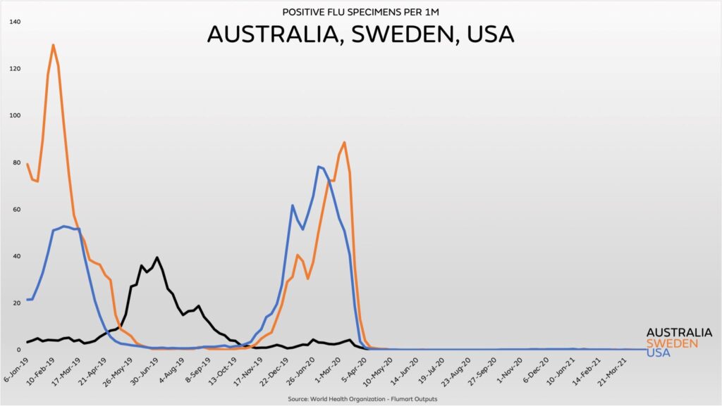 - ¿Si tan buenas eran esas máscaras contra la gripe por qué en 2021 tampoco hubo gripe en los países que no usaron máscaras? Veamos cómo Suecia, el país sin máscaras, vio desvanecerse la gripe al mismo tiempo que EEUU y poco después de por ejemplo Australia en el otro hemisferio.