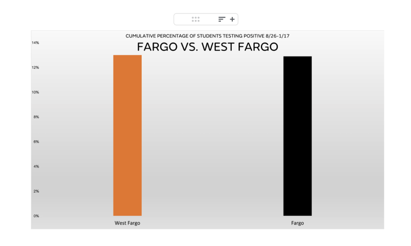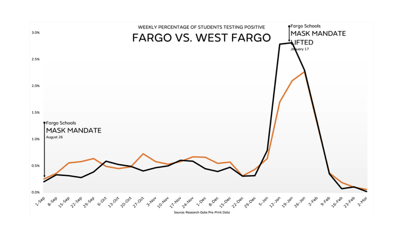 Antes de regresar a Fauci y su cambiante opinión, merece la pena saber que en verano de 2022 se publicó el probablemente mejor estudio observacional sobre máscaras y covid. Probablemente el mejor porque compara durante meses dos distritos escolares cercanos en Dakota del Norte con una política y uso real de máscaras diametralmente opuestas en escuelas, con casi idéntica población escolar (12.000 estudiantes por distrito) y misma distribución socio-económica y racial-cultural (80% blancos, 80% clase media y alta), incluso mismos alumnos promedio por clase (entre 19 y 23 según el curso). Hablamos de los distritos de Fargo y West Fargo. Es más, todas las demás posibles ‘medidas covid’ fueron idénticas en cuanto a tests, limpieza, reuniones y aglomeraciones, ventilación, cuarentenas…etc La única variable distinta, y radicalmente distinta, fue el uso de máscaras. En un distrito los escolares estaban obligados a usarlas, en el otro no. La Dra Tracy Hoeg y el profesor de políticas de salud pública Neeraj Stood de la U. de California del Sur junto con el analista de datos Josh Stevenson establecieron el uso real de máscaras por prácticamente el 100% en el distrito con obligación y no superior al 5% en el distrito sin obligación, entre inicio septiembre 2021 y final enero 2022. Recordemos que toda medida fue idéntica en distritos escolares perfectamente intercambiables, excepto el uso de máscaras. Parece el estudio observacional definitivo sobre máscaras ¿Cuál fue la diferencia entre que el 100% la usara versus que el 95% como mínimo nunca la usara? Éstos son los resultados brutos gráficamente.
