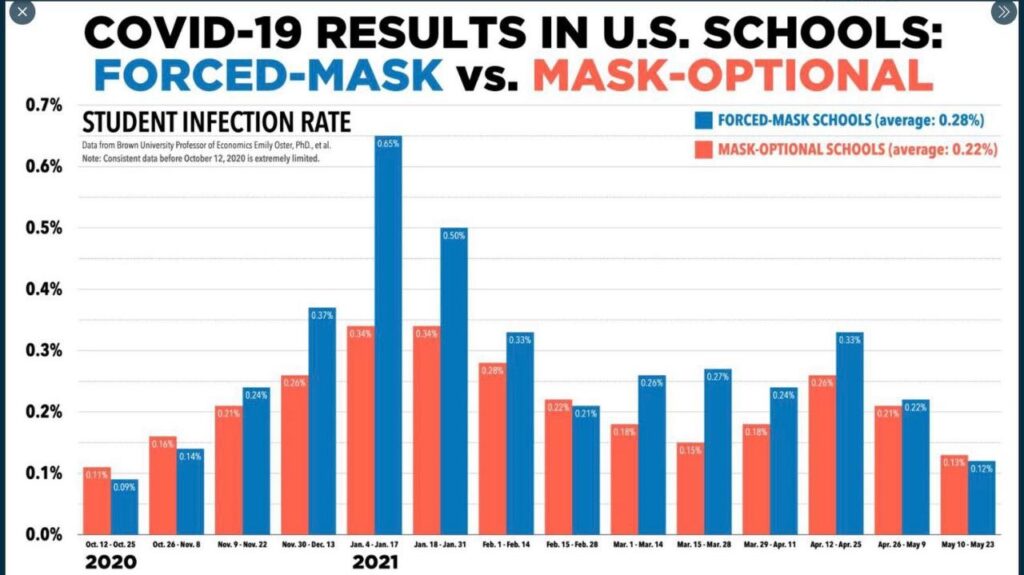 Así es, pues de hecho Journal of Infection publica en diciembre de 2022 un estudio sobre la ausencia de correlación entre uso de máscaras en escuelas y contagios. Más gráficamente aún, vemos incluso como en promedio todos los distritos escolares con máscaras obligatorias en EEUU tuvieron más contagios en 2020 y 2021, y no menos según la recopilación de datos de la doctora en economía Emily Oster de la Universidad de Brown.