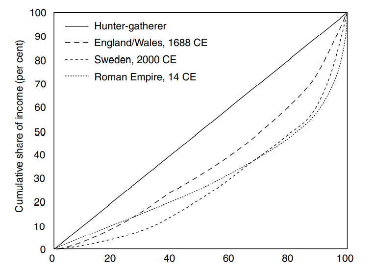 Los agoreros del progreso tienden a focalizarse única y exclusivamente en el problema de la desigualdad, cuando esta es, simple y llanamente, la superación de la pauperización de la gran mayoría de personas. Puede haber desigualdad económica en tanto en cuanto haya una generación de riqueza. Como se muestra en la Figura 2, a través del cálculo de la distribución del coeficiente de Gini, la muestra engloba desde las sociedades del 10000 aC hasta el presente.
