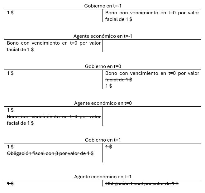Si el gobierno emite bonos para recibir financiación en t=0, monetiza esa deuda, pero posteriormente retira toda esa oferta monetaria creada mediante el cobro de impuestos, entonces la oferta monetaria de moneda se mantiene en los niveles en los que estaba previa a la emisión de Bº. Veámoslo en forma de balance: