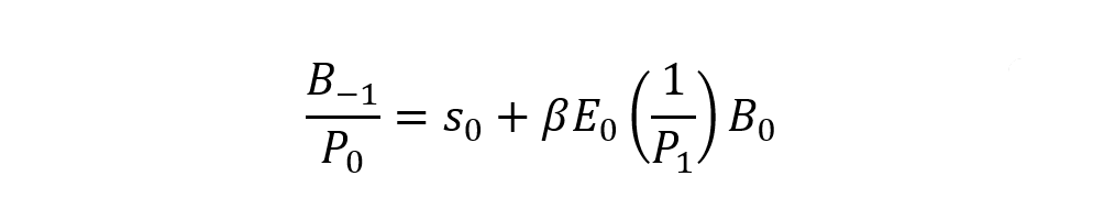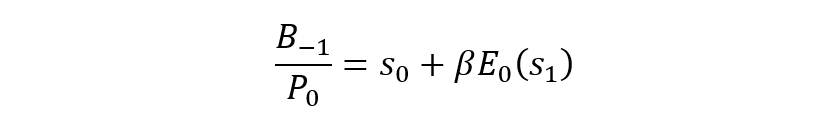Para entender las raíces fiscales de las variaciones en el nivel de precios, primero habremos de observar una de las condiciones de equilibrio de la teoría, previo a introducir cualquier otra fricción, y asumiendo precios totalmente flexibles y tipos de interés constantes, donde P1 es el nivel de precios en t=1, Bº la venta de bonos en t=0 y S1 los superávits primarios en t=1 (Cochrane, 2023):