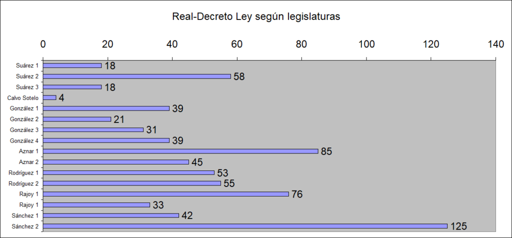 El gobierno de Sánchez ostenta el récord absoluto: en su primera legislatura, de apenas unos meses, se fue a veinticinco. Pero eso no ha sido nada con la legislatura pasada que acabamos de superar: ciento veinticinco, récord absoluto. De esta forma, el ejecutivo usurpa las legítimas funciones del legislativo, manda a tomar viento fresco la separación de poderes y, lo que es peor, se convierte en una herramienta de chantaje político.